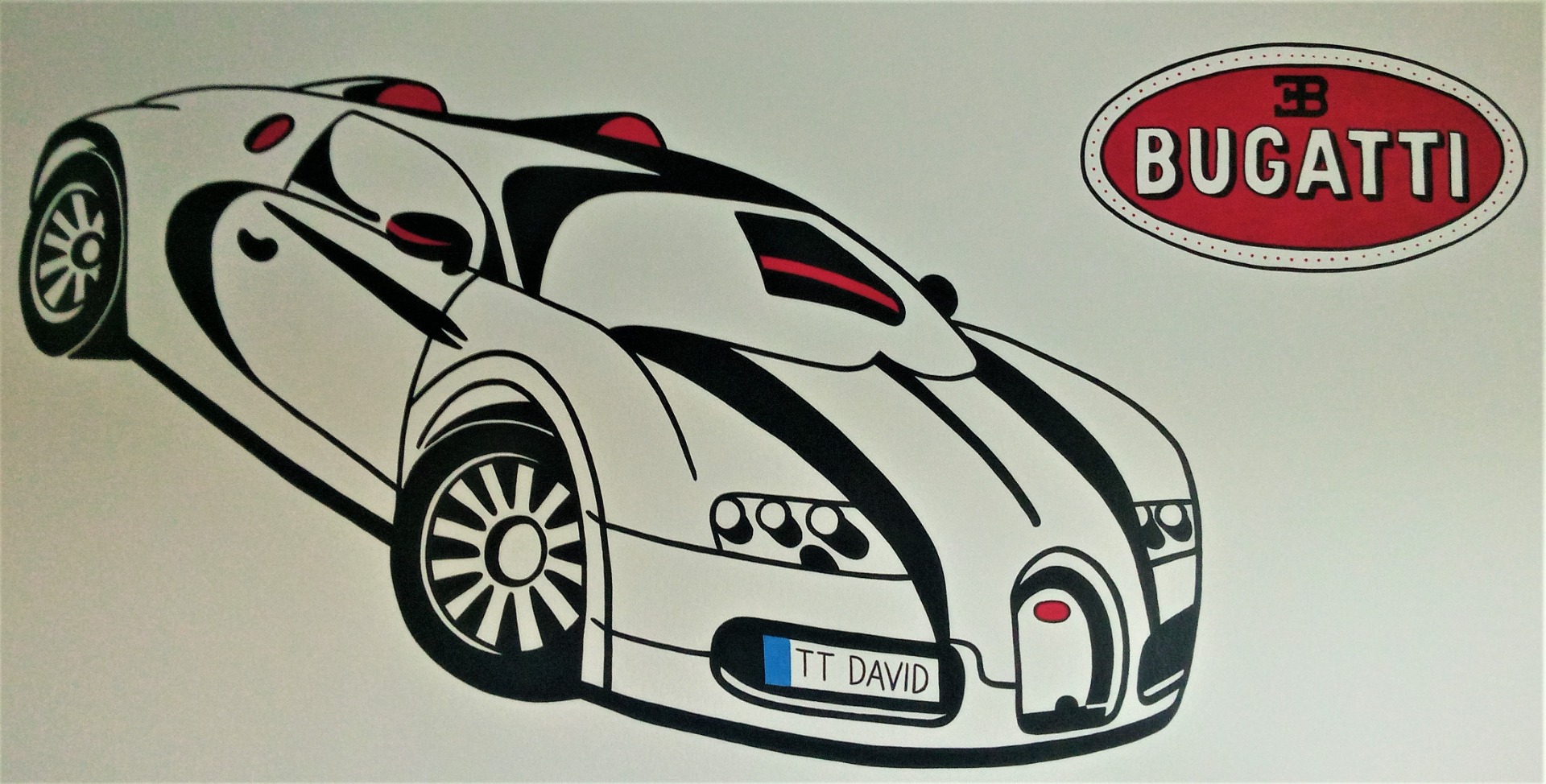 Je radosťou maľovať obrázok pre radosť, keď objednávateľ vie presne, čo chce. Išlo o čiernobiely obrázok vozidla Bugatti s prvkami červenej farby spolu s logom vozidla. Obrázok je umiestnený priamo nad posteľou, tak aby sa každé ráno chlapček prebúdzal s pohľadom na jeho vysnívané vozidlo.